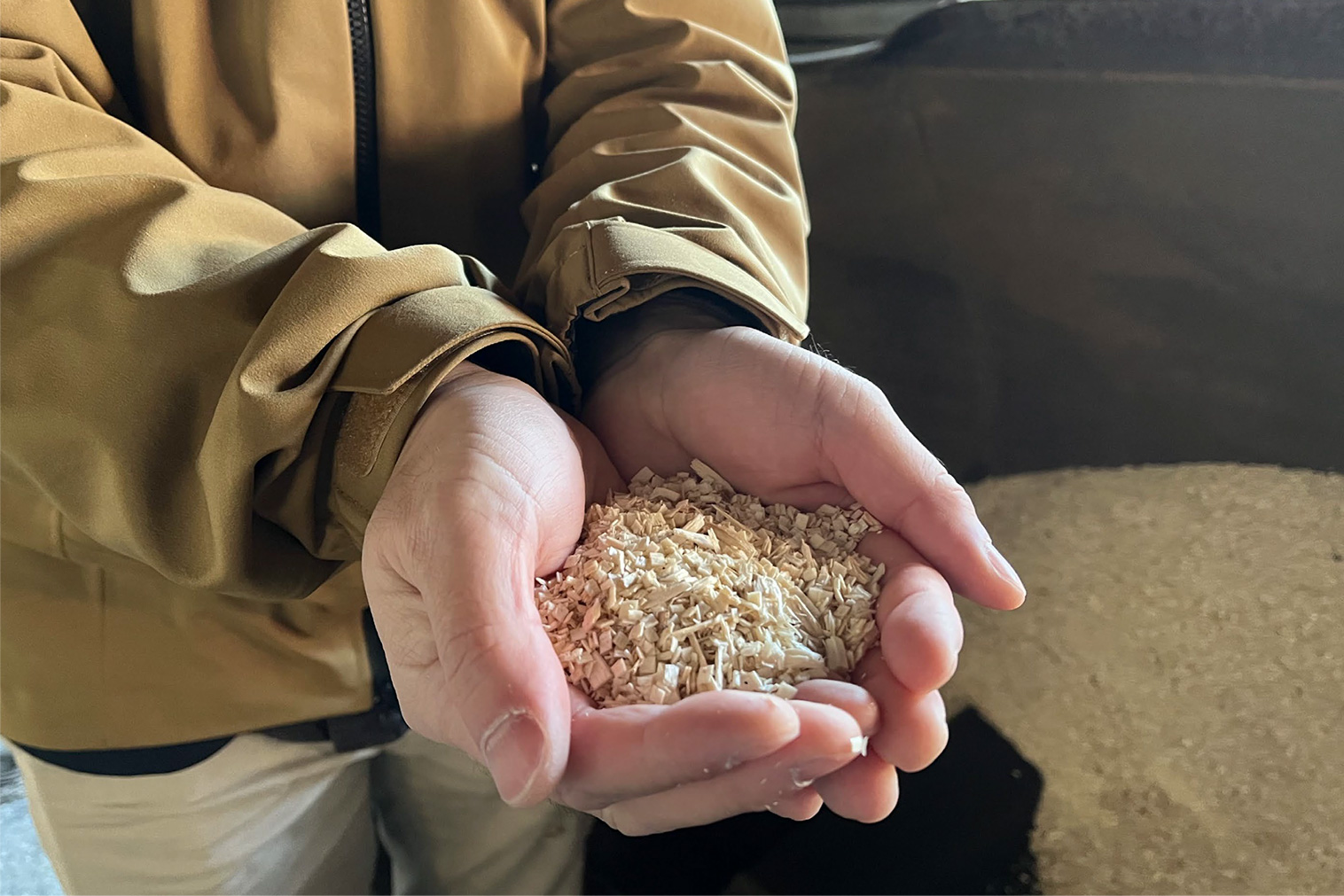 北畑:俺たちは普段、「この木は何に使うか」「どこに出すか」っていう見方をしてる。提供するお客さんの求めるロットや品質に合わせて、使う機械も自然と変わってくるんだ。香りが価値になるということを基準に考え始めると、砕き方も、乾かし方も、その後の扱いも変わってくるかもしれないね。今日は、普段は雑木として他のチップと混ぜてしまう白樺を、あえて単体でチップにしてみたんだけど、改めて『白いなぁ』って思ったよ。